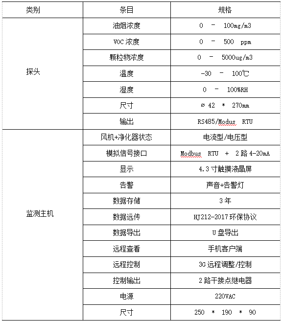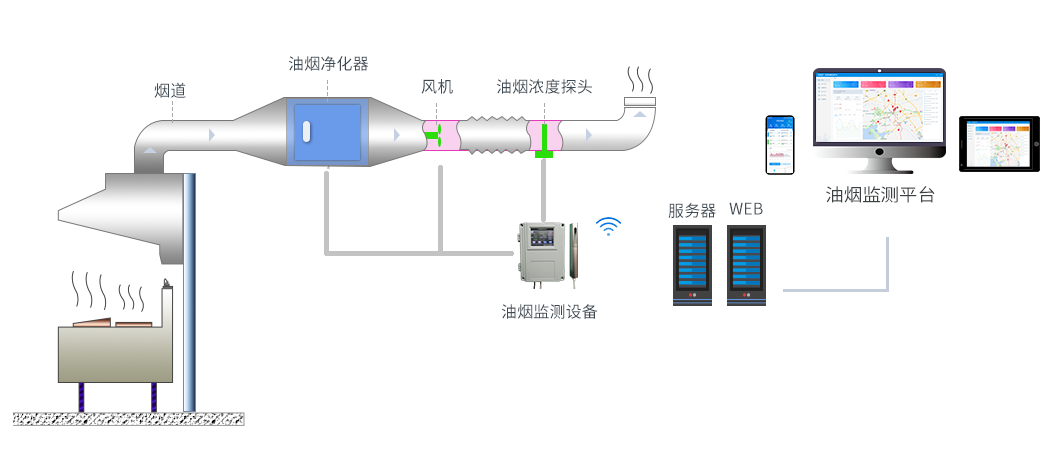 對油煙排污數(shù)據(jù)的監(jiān)測,包括油煙排放濃度,顆粒物,NmHc等數(shù)值采集監(jiān)測;同時(shí)對監(jiān)控風(fēng)機(jī)和凈化器的啟停狀態(tài)、運(yùn)行數(shù)據(jù)進(jìn)行監(jiān)測。
