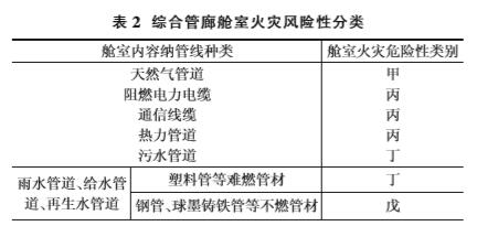 根據(jù) 《城市綜合管廊工程技術(shù)規(guī)范》(GB508382015),綜合管廊艙室火災(zāi)危險(xiǎn)性分類(lèi)如表2所示:天然氣管道艙室的火災(zāi)危險(xiǎn)性類(lèi)別為較高級(jí);阻燃電力電纜、通信電纜、 熱力管道的火災(zāi)危險(xiǎn)性類(lèi)別均為丙級(jí);污水管道、塑料管等難燃管材的火災(zāi)危險(xiǎn)性類(lèi)別均為丁級(jí);鋼管、球墨鑄鐵管等不燃管材的火災(zāi)危險(xiǎn)性類(lèi)別為戊級(jí)。