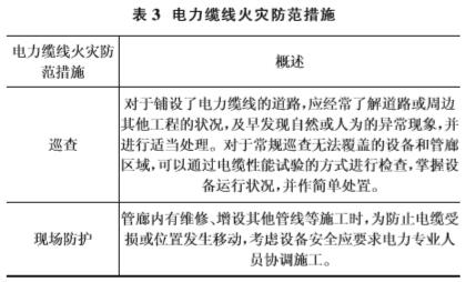 ⑥電力纜線在施工時(shí)采用明火引起的火災(zāi)。通過(guò)對(duì)綜合管廊電力纜線火災(zāi)危險(xiǎn)性的分析,需要對(duì)電力纜線做好維護(hù)與管理工作,防范電力電纜火災(zāi)的發(fā)生,防范措施如表3所示。