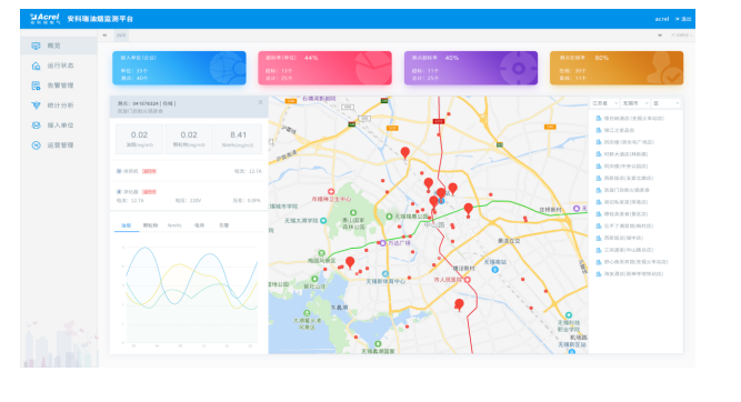 平臺(tái)GIS地圖采集餐飲油煙處理設(shè)備運(yùn)行狀態(tài)和油煙排放的濃度數(shù)據(jù),自動(dòng)對(duì)超標(biāo)排放及異常企業(yè)進(jìn)行提示預(yù)警,監(jiān)管部門(mén)可迅速進(jìn)行處理,督促餐飲企業(yè)整改設(shè)備,并定期清洗、維護(hù),實(shí)現(xiàn)減排環(huán)保,不擾民等目的?,F(xiàn)場(chǎng)安裝監(jiān)測(cè)終端,持續(xù)監(jiān)測(cè)油煙凈化器的工作狀態(tài),包括設(shè)備運(yùn)行的電流、電壓、功率、耗電量等等,同時(shí)結(jié)合排煙口的揮發(fā)性物質(zhì)、顆粒物濃度等進(jìn)行對(duì)比分析,一旦排放超標(biāo),系統(tǒng)會(huì)發(fā)出異常信號(hào)。