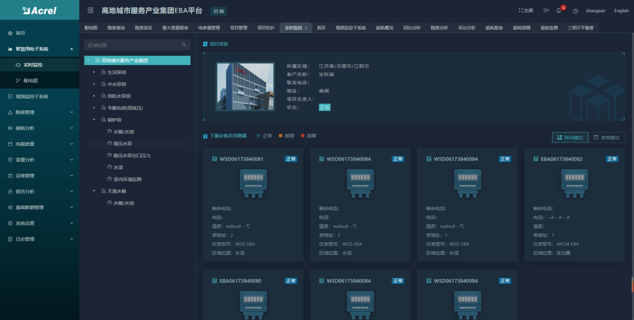 用戶登錄成功之后進(jìn)入首頁,如圖所示。主要展示的內(nèi)容有:項(xiàng)目概況、設(shè)備狀態(tài)、設(shè)備分類、設(shè)備報(bào)警信息、報(bào)警分類、報(bào)警統(tǒng)計(jì)、設(shè)備臺(tái)賬信息等。其中百度地圖可以選配成BIM建筑模型,任何傳感器報(bào)警時(shí)可以在BIM模型中預(yù)警顯示。