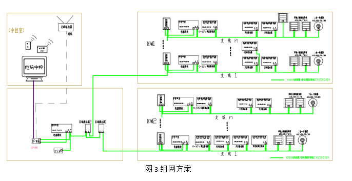 智能照明控制系統(tǒng)組網(wǎng)方式靈活,擴展方便,當系統(tǒng)模塊數(shù)量較少、距離較近、范圍較小時,各設(shè)備以樹形枝狀延伸,構(gòu)成支路系統(tǒng)智能照明控制系統(tǒng);當系統(tǒng)模塊數(shù)量較多、距離較遠、范圍較大時,用支線耦合器組成多條支路,構(gòu)成區(qū)域智能照明控制系統(tǒng);當系統(tǒng)模塊數(shù)量很多、距離很遠、范圍很大時,用支線耦合器、區(qū)域耦合器等構(gòu)成樓群智能照明控制系統(tǒng)。(見圖)
