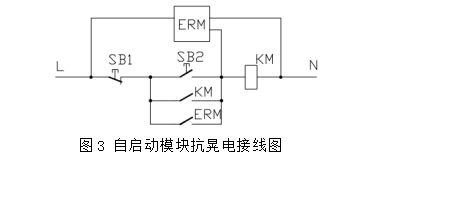 這種抗晃電方式,是某化工廠部分配電室原有的帶自啟動模塊(ERM)的一種接線方式,與一種單時(shí)間繼電器方式差不多,如圖3所示,當(dāng)電網(wǎng)發(fā)生波動時(shí)4s鐘之內(nèi)恢復(fù)供電(4s鐘固定不可調(diào)),自啟動模塊的節(jié)點(diǎn)延時(shí)閉合,啟動電動機(jī),4s以后來電就不再啟動電動機(jī)。自啟動模塊(ERM)自開工至今已經(jīng)使用十幾年了,由于原來的自啟動模塊(ERM)原件已老化,不能準(zhǔn)確動作,新模塊又采購不到,所以,這種模式已基本被淘汰。
